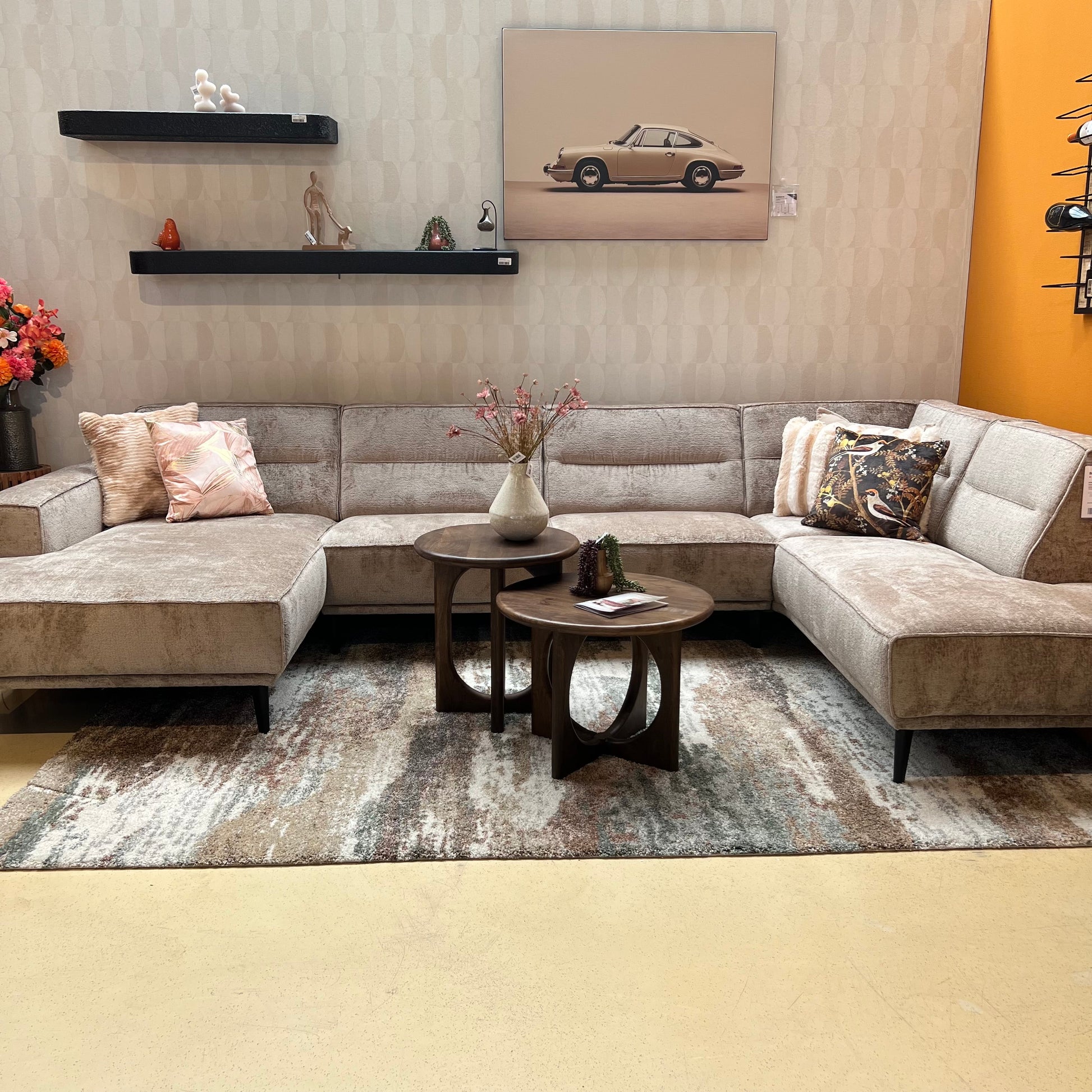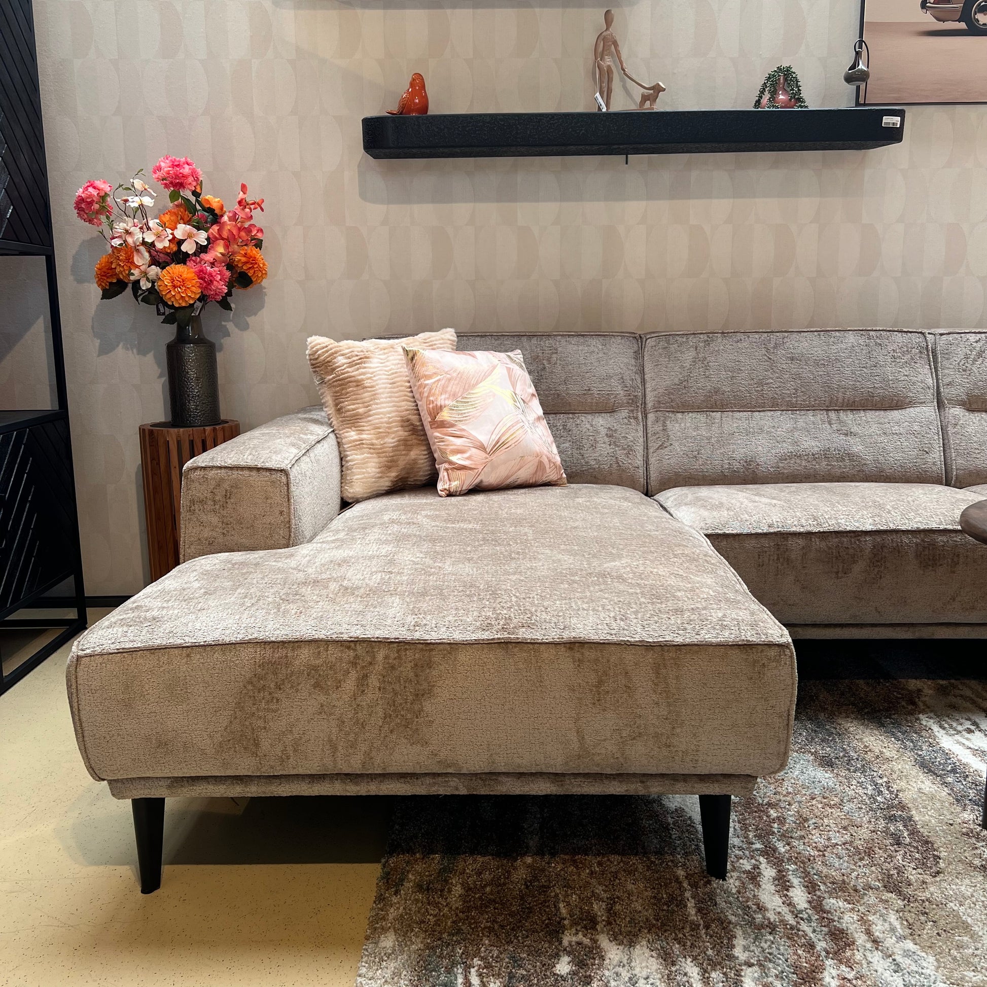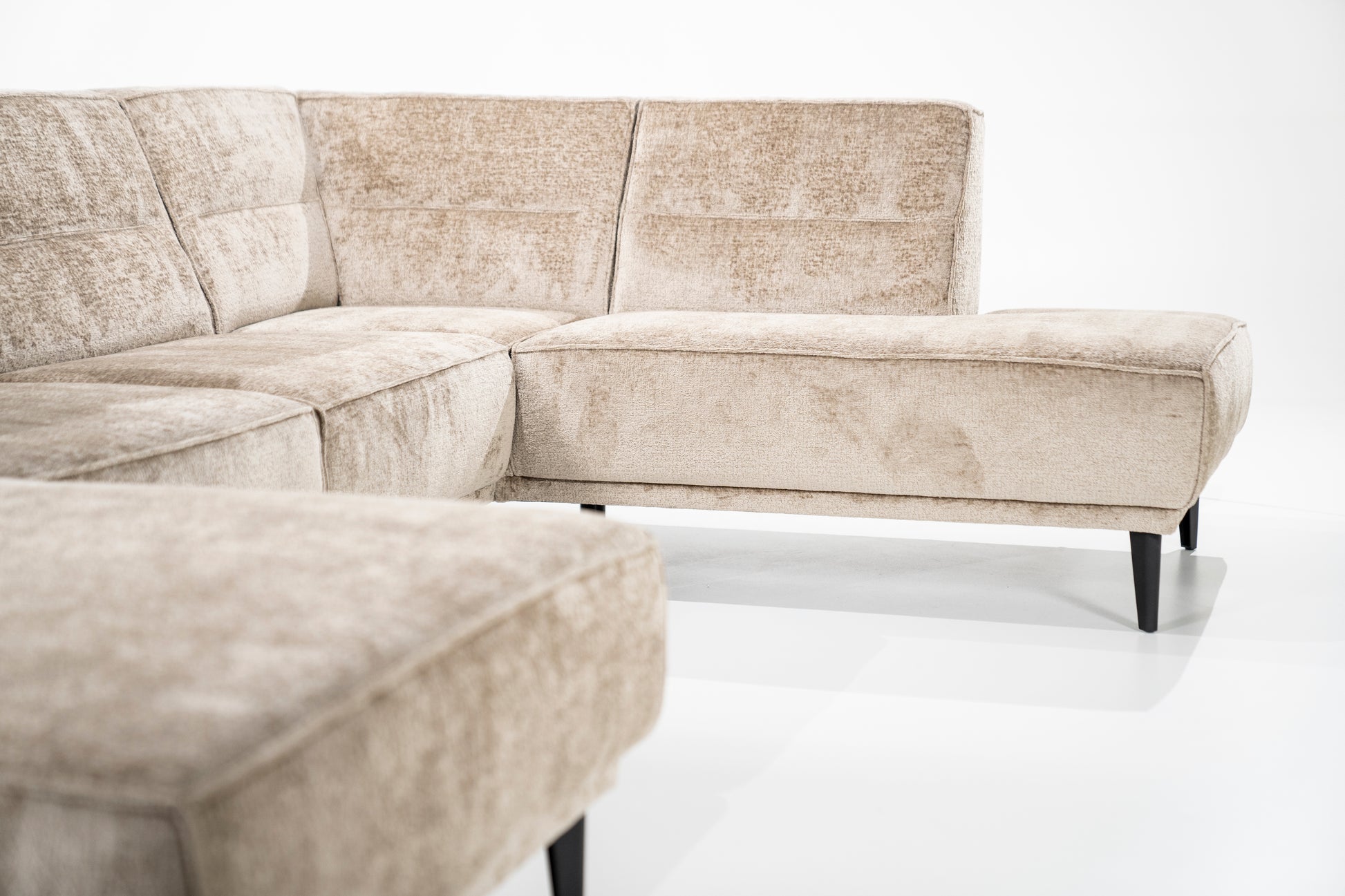 Zoals afgebeeld, is de hoekbank uitgevoerd met een sofa arm links, een 3-zits zonder armen, en een zithoek met ottomane rechts, in de stof Bergen in de kleur taupe (stofgroep D). De totale breedte van deze uitvoering is 359 cm, en je kunt deze bank in onze showroom bekijken. De getoonde prijs is de vanafprijs voor deze stof.