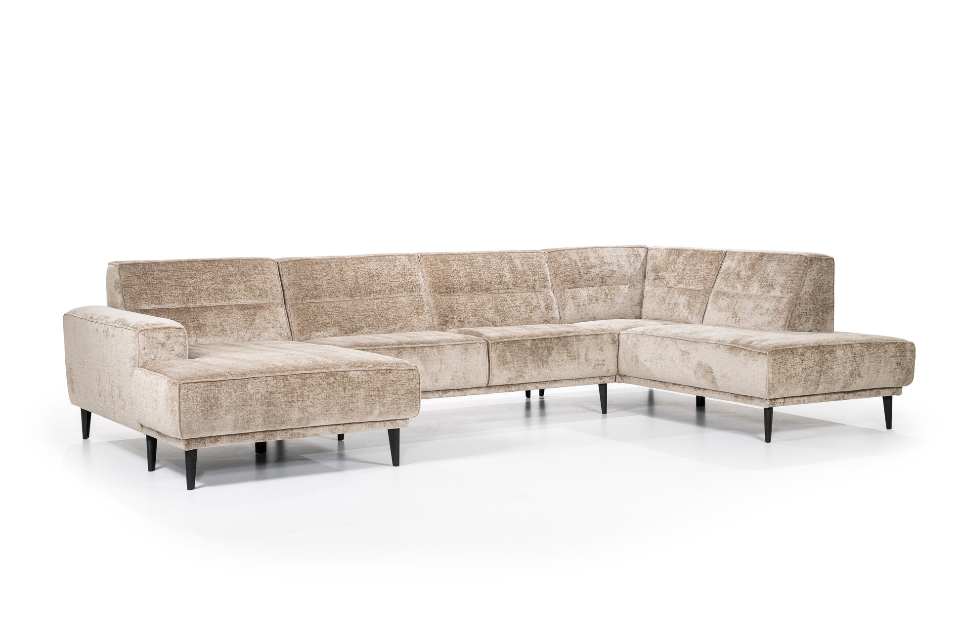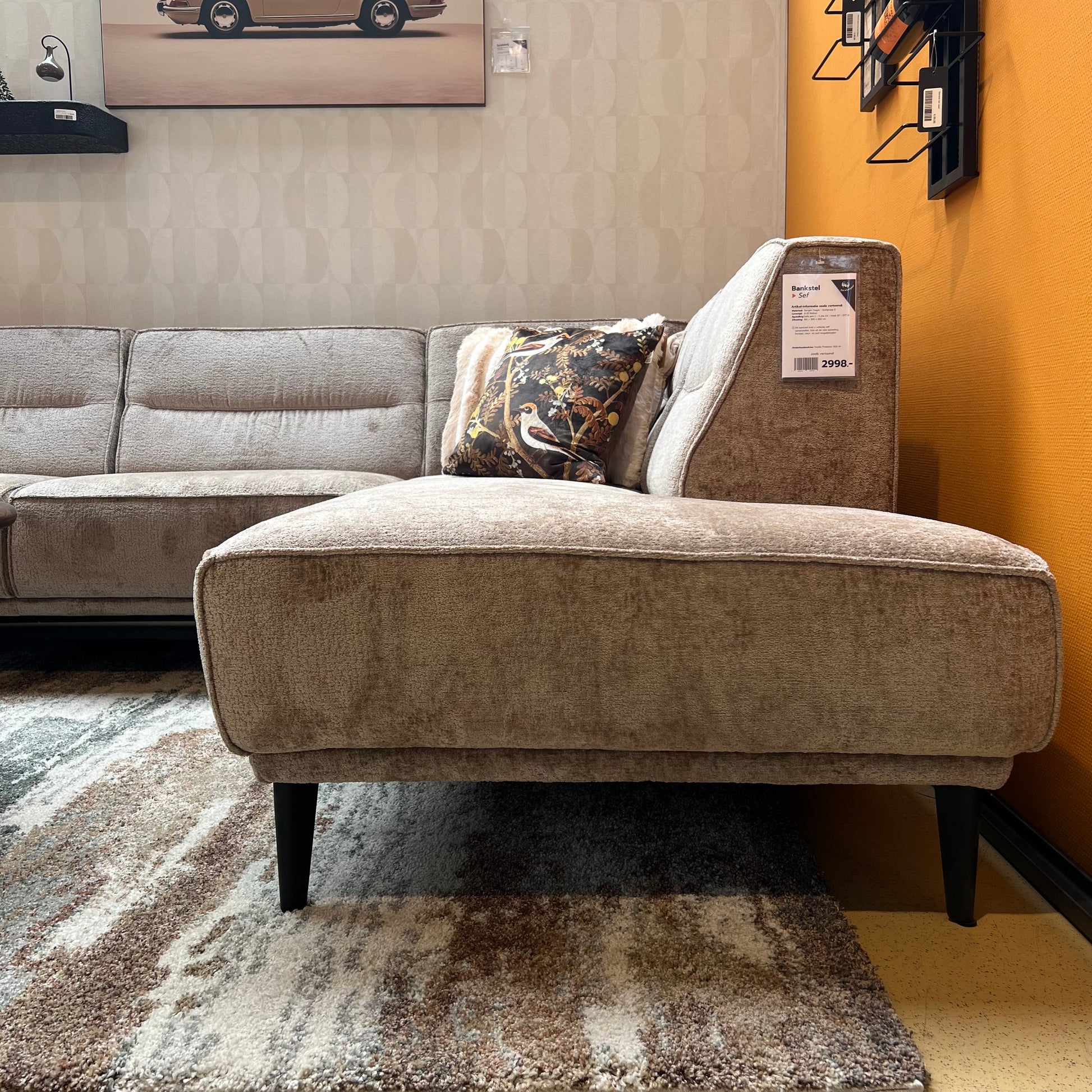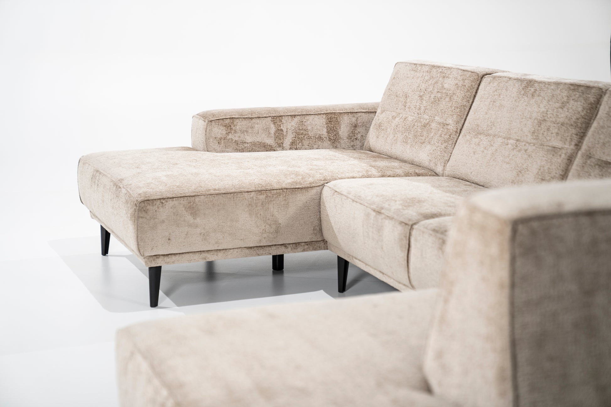 Zoals afgebeeld, is de hoekbank uitgevoerd met een sofa arm links, een 3-zits zonder armen, en een zithoek met ottomane rechts, in de stof Bergen in de kleur taupe (stofgroep D). De totale breedte van deze uitvoering is 359 cm, en je kunt deze bank in onze showroom bekijken. De getoonde prijs is de vanafprijs voor deze stof.