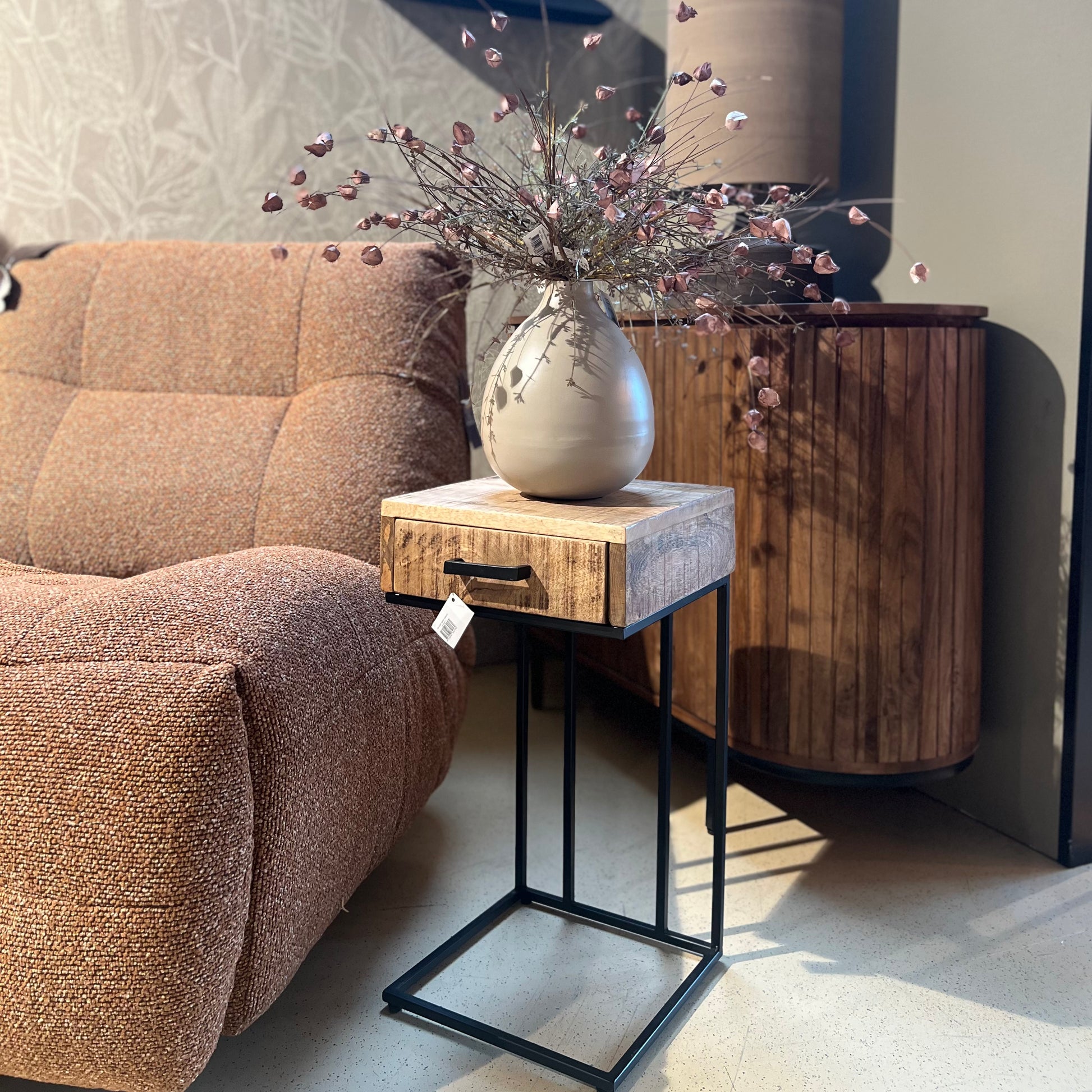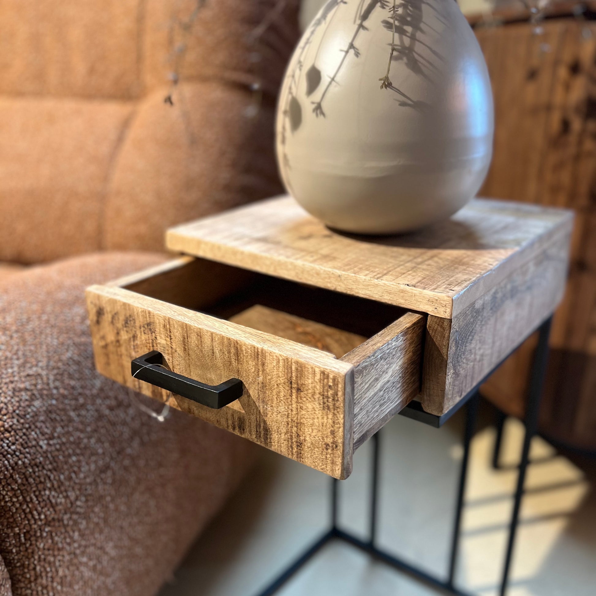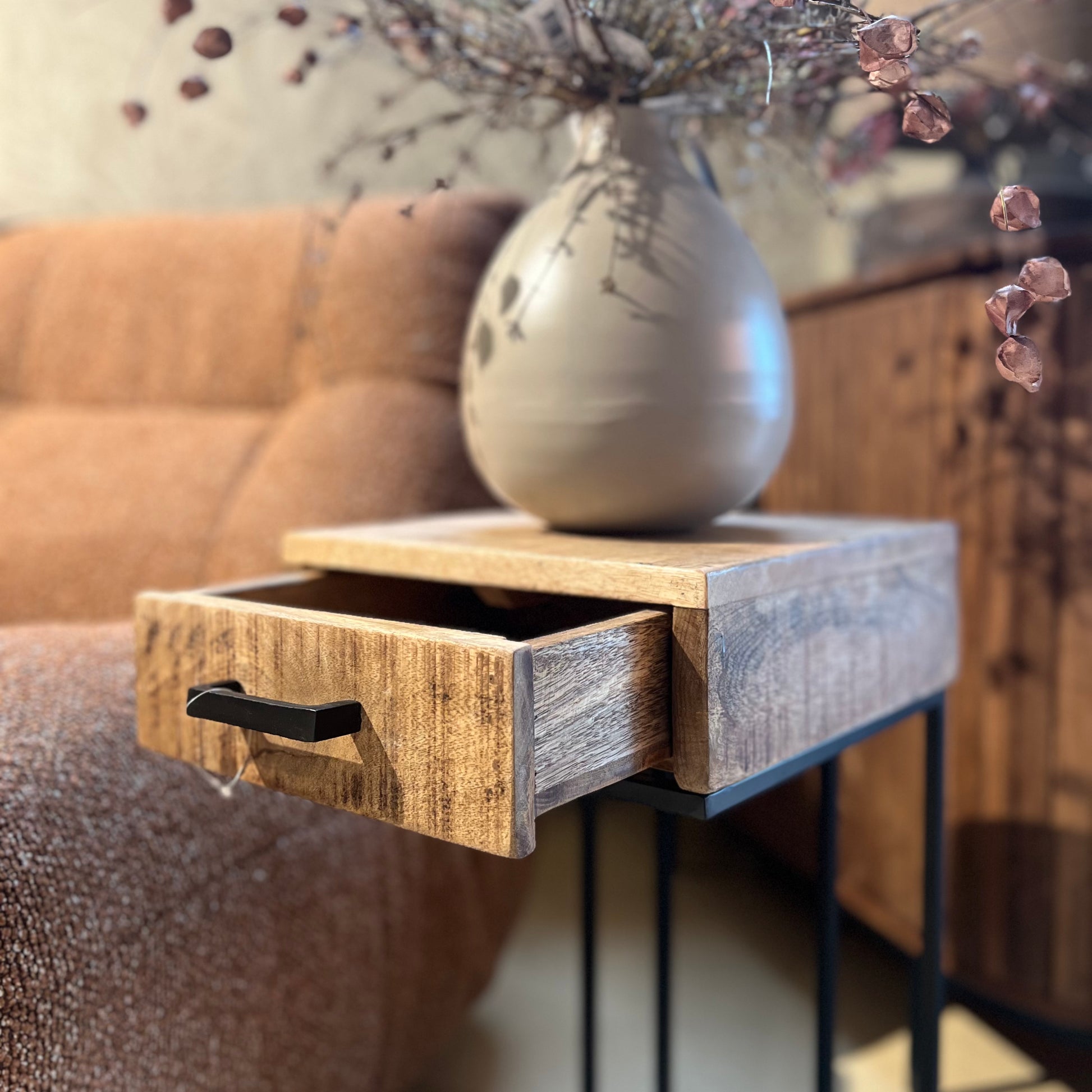 Met zijn tijdloze uitstraling past deze mangohouten bijzettafel met lade moeiteloos in zowel moderne als industriële woonstijlen. Perfect voor wie houdt van praktisch design met een natuurlijke touch.