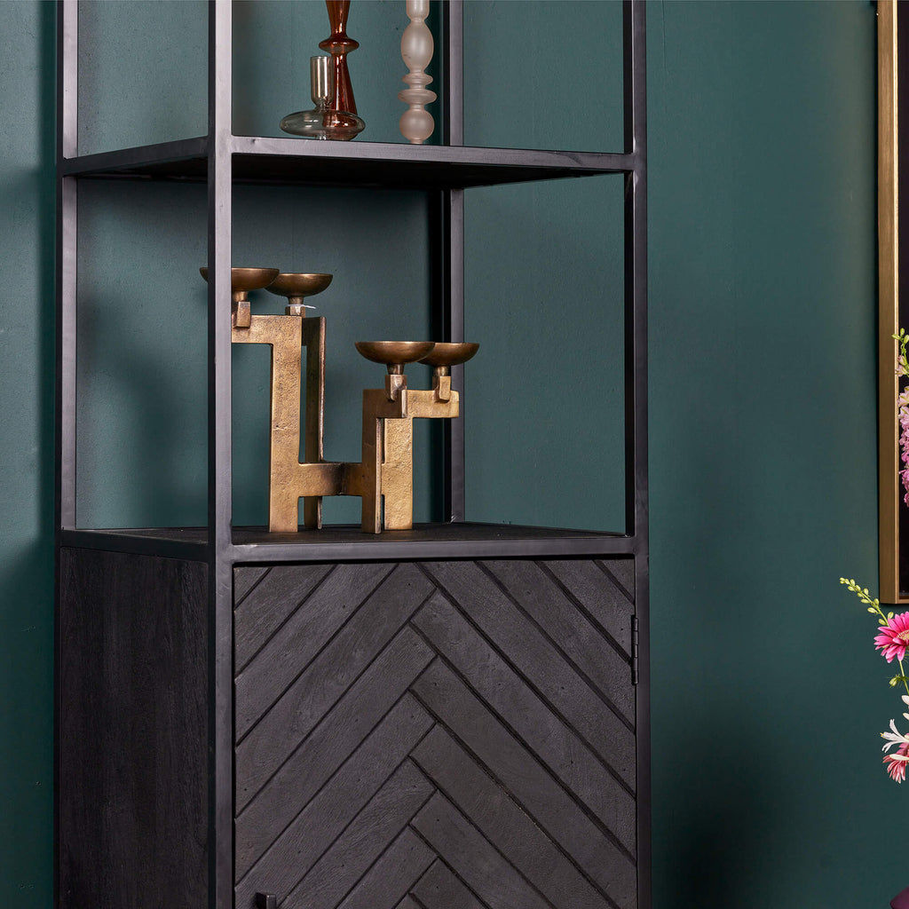 Deze boekenkast uit onze New York serie heeft 1 deur en een legplank. De kast is uitgevoerd in gezandstraald massief mangohout en is behandeld met een zwarte lak. Het mangohout in de deur is ingelegd in een visgraatpatroon. Het frame en de handgreep zijn gemaakt van metaal en afgewerkt met een zwarte lak.