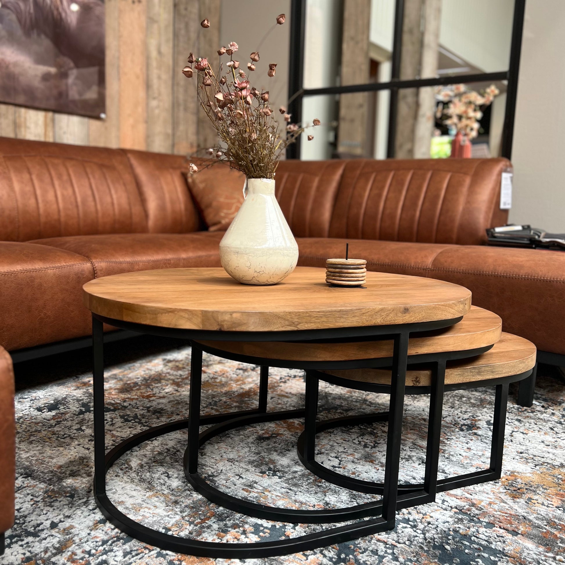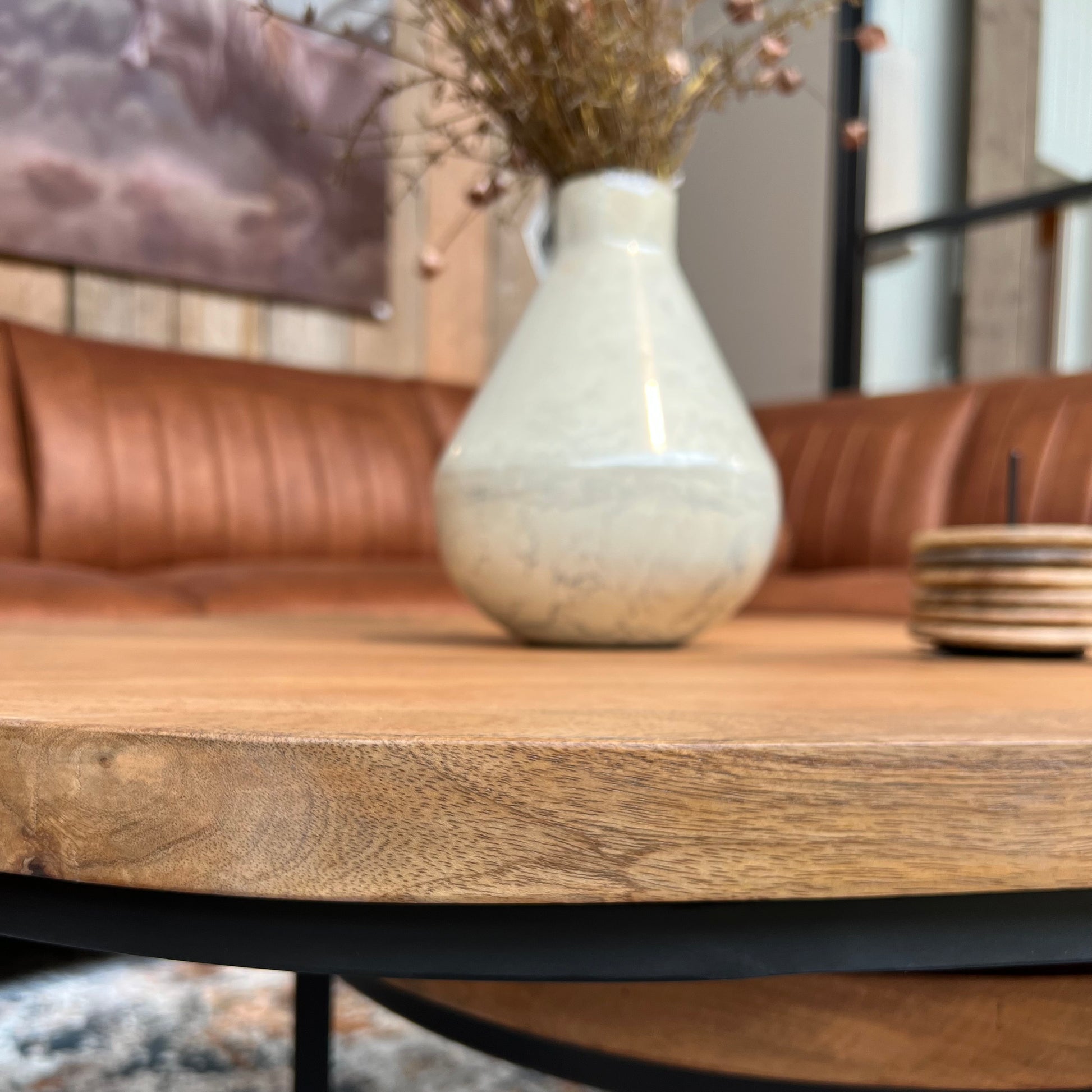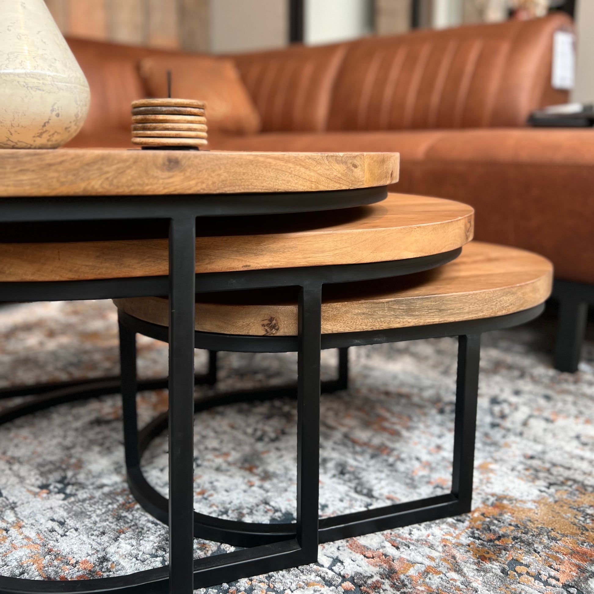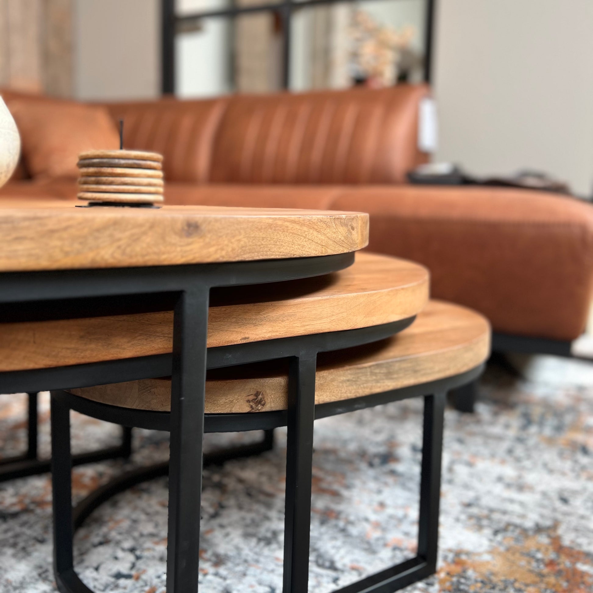 De Bridge salontafelset combineert stoer design met praktisch gebruiksgemak. Deze 3-delige set is gemaakt van hoogwaardig massief mangohout en voorzien van een robuust zwart metalen onderstel. Wat deze set écht onderscheidt? Het extra dikke tafelblad van meer dan 3 cm – een opvallend detail dat direct luxe en kwaliteit uitstraalt.