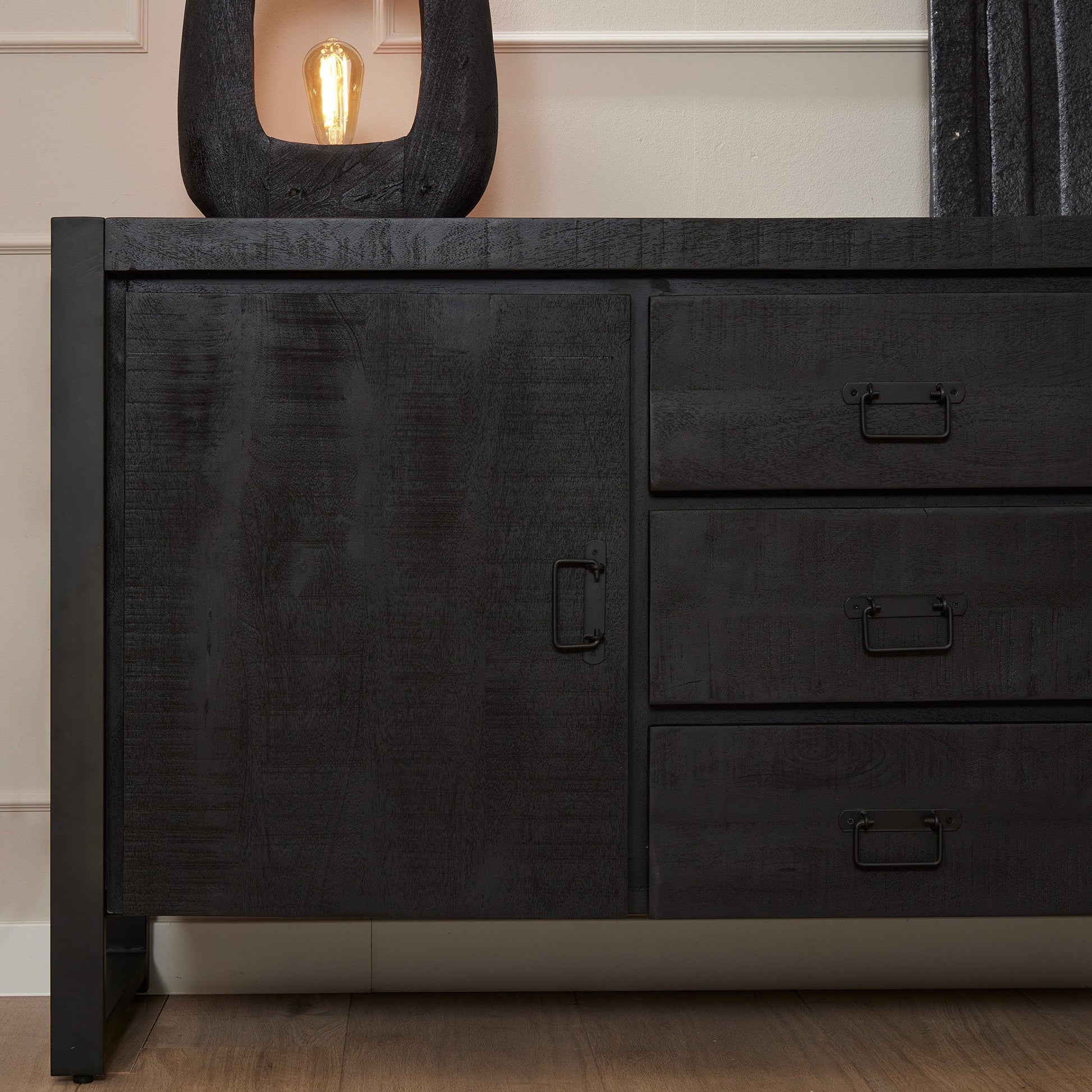 Dressoir Kira Black is uitgevoerd in het mangohout. Het metalen frame en de metalen handgrepen zijn afgewerkt met een zwarte lak. Dit model is voorzien van vier deuren. Achter de zittende deuren handige legplanken. Het dressoir is ingelegd met verschillende stroken zwart gelakt hout, waar het meubel zijn eigentijdse karakter aan te danken heeft.