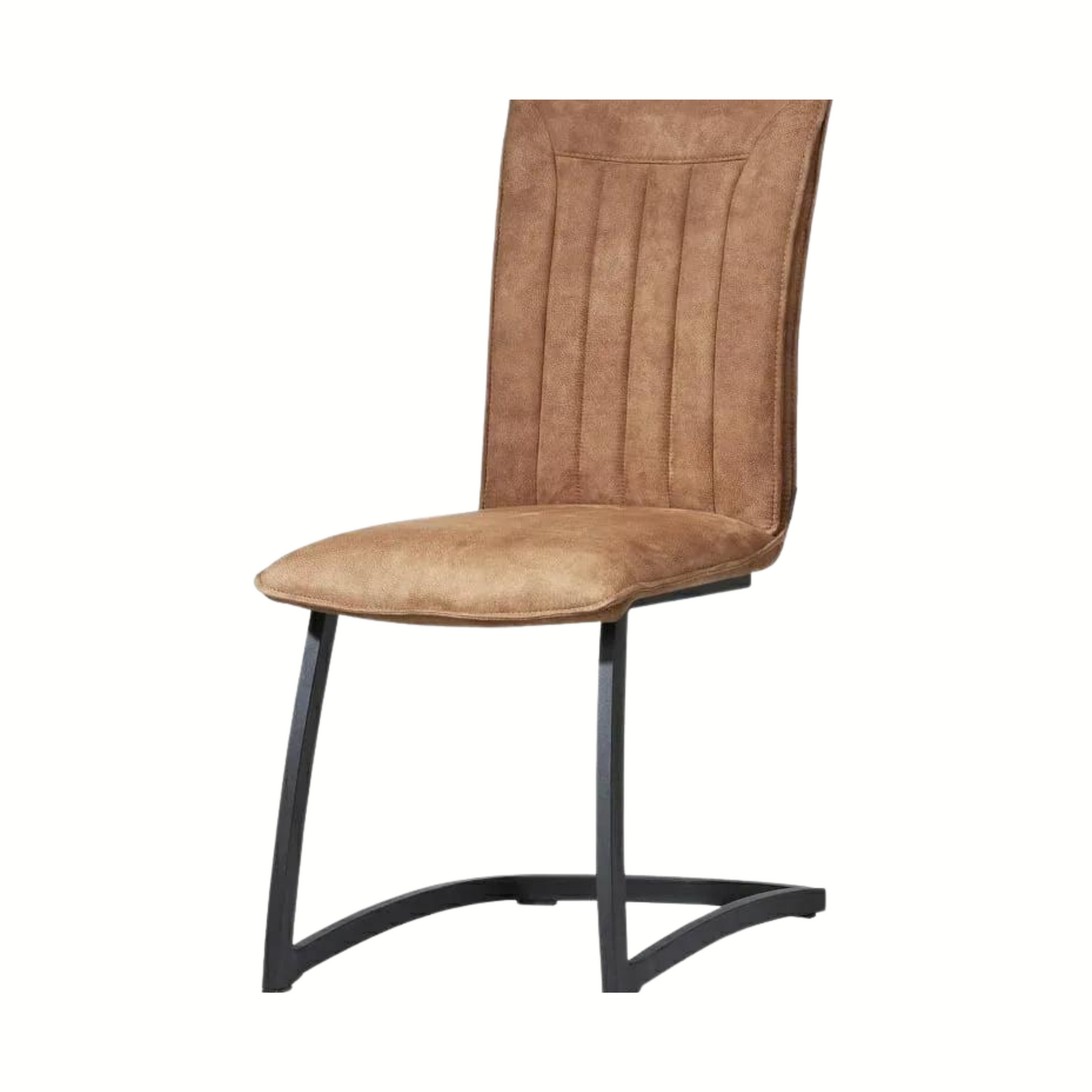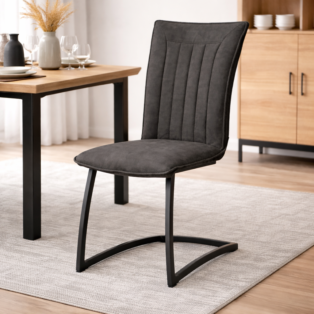 De eetkamerstoel Amara combineert een stoere, industriële uitstraling met comfortabel zitgemak. De zitting is bekleed met sterke microvezelstof die aanvoelt als leer, maar veel onderhoudsvriendelijker is. Dankzij de hoge rugleuning en licht verende (free-swing) metalen poten zit je ook tijdens lange diners comfortabel.