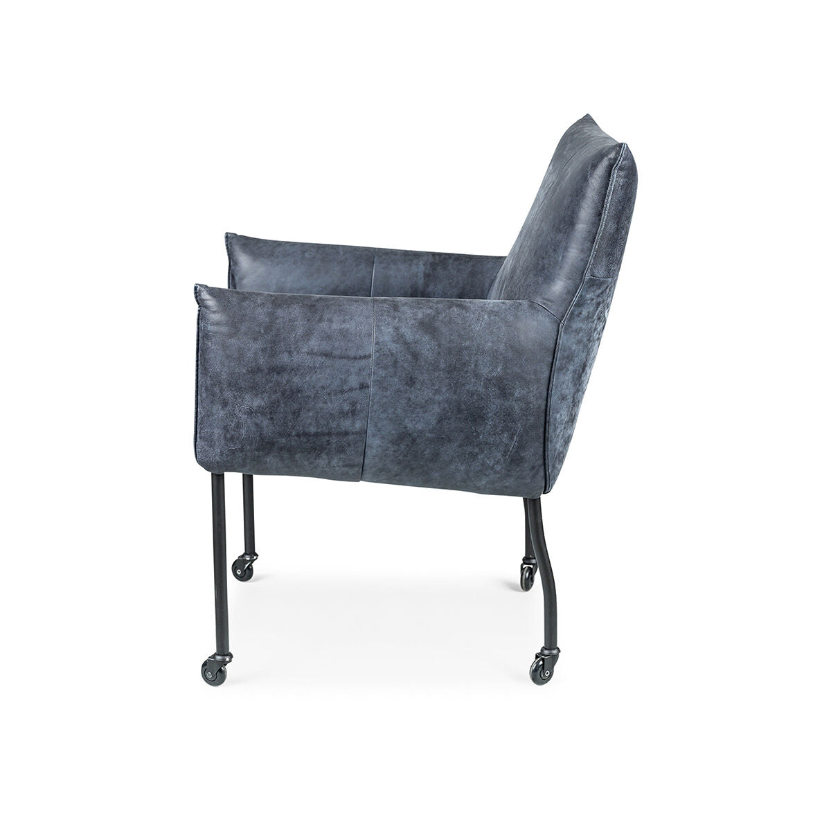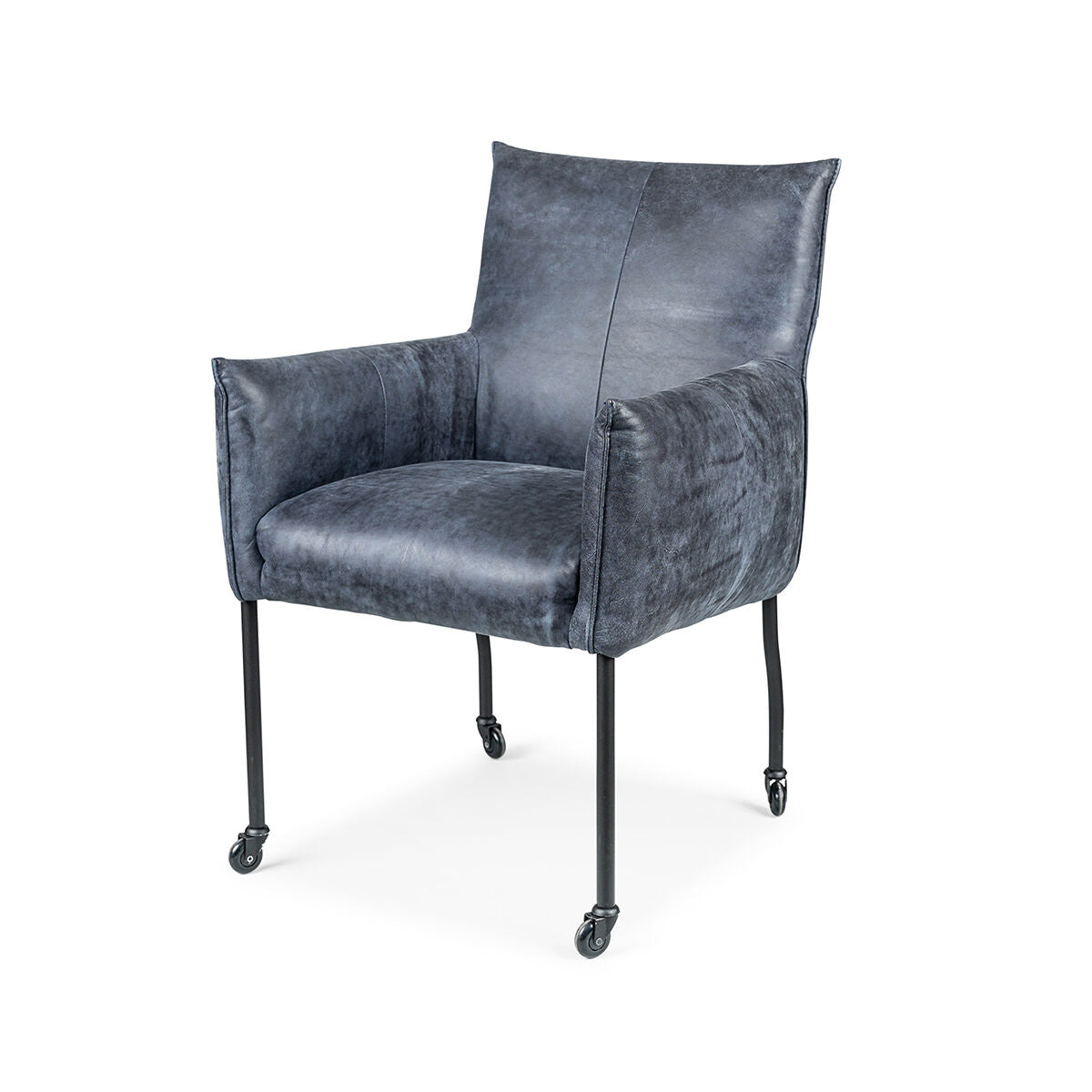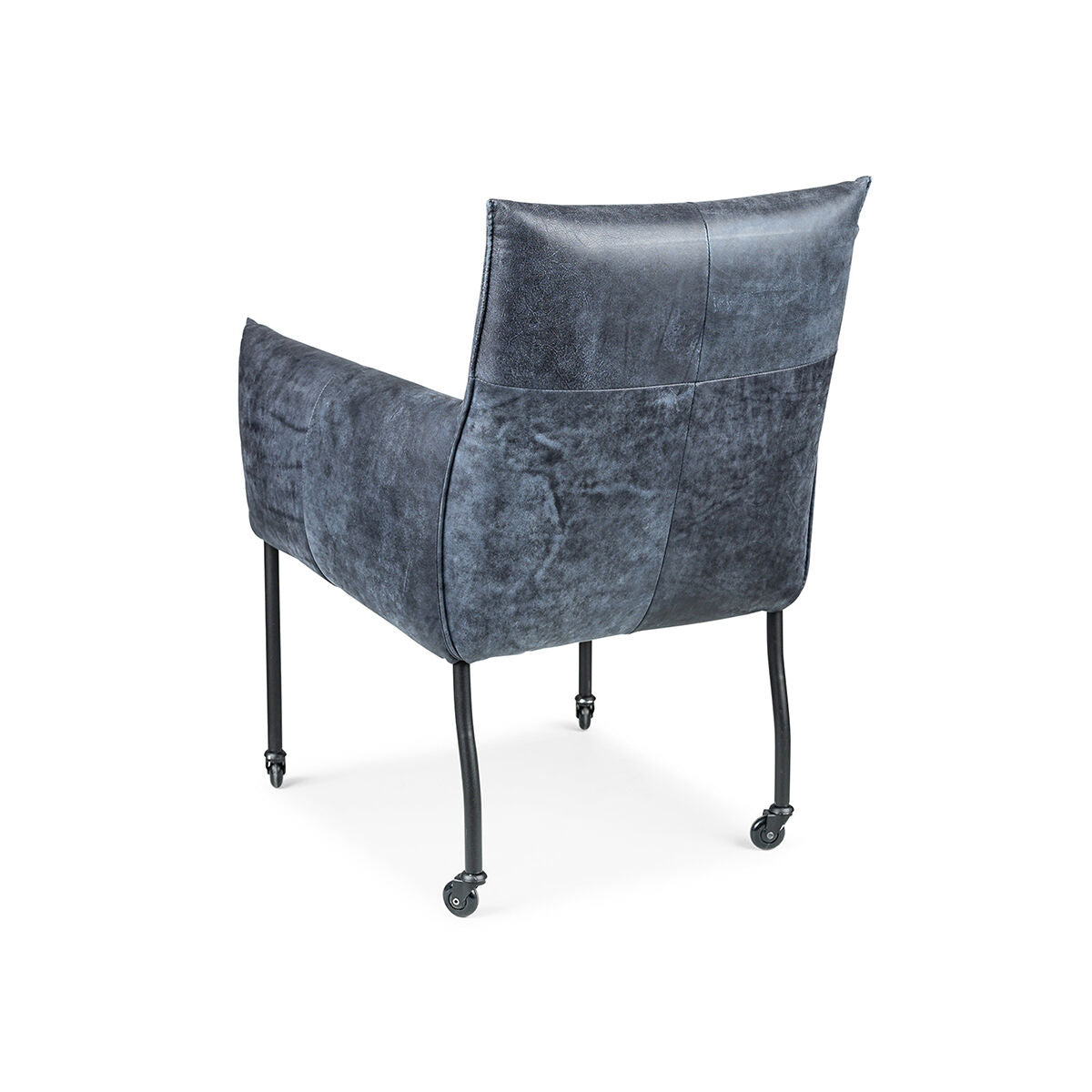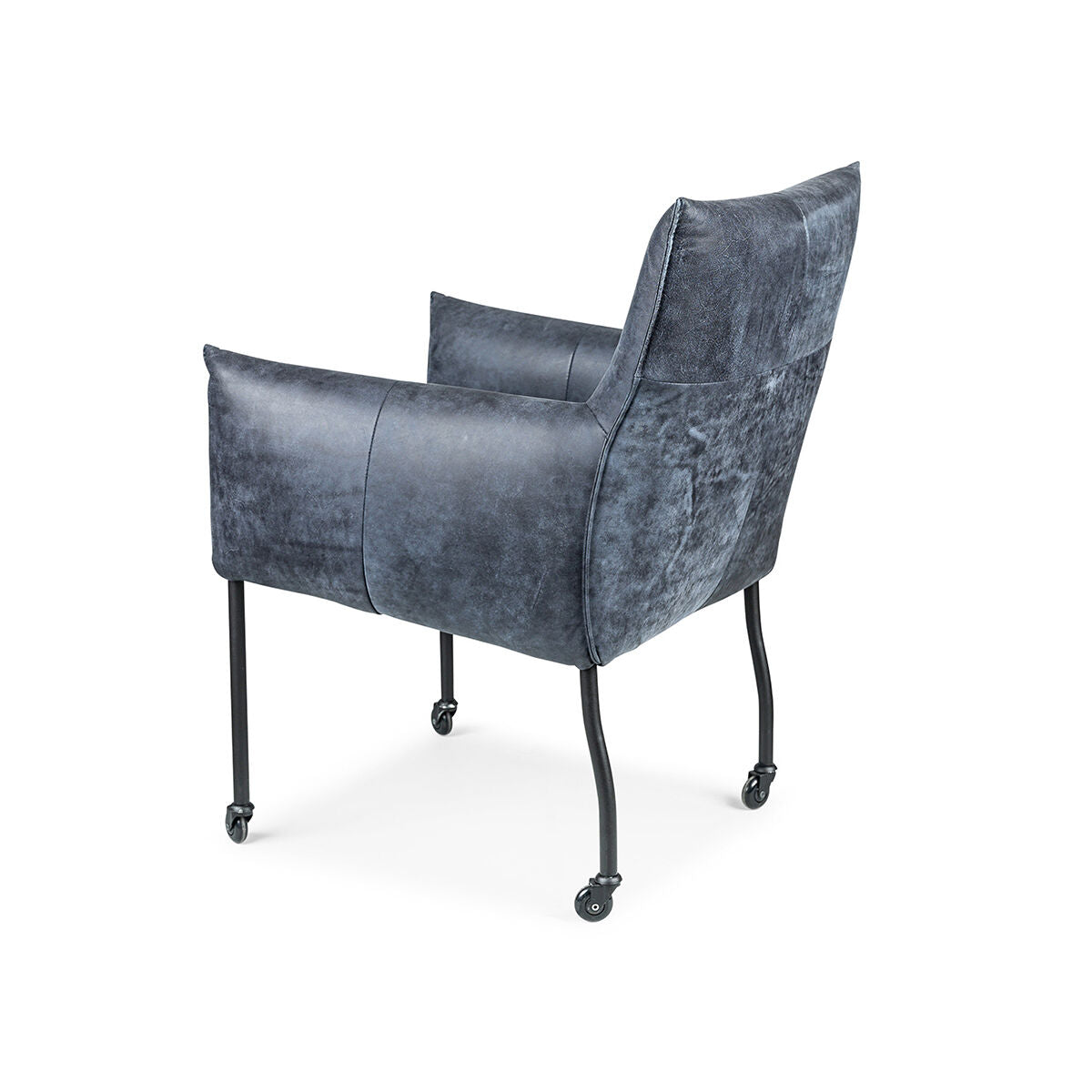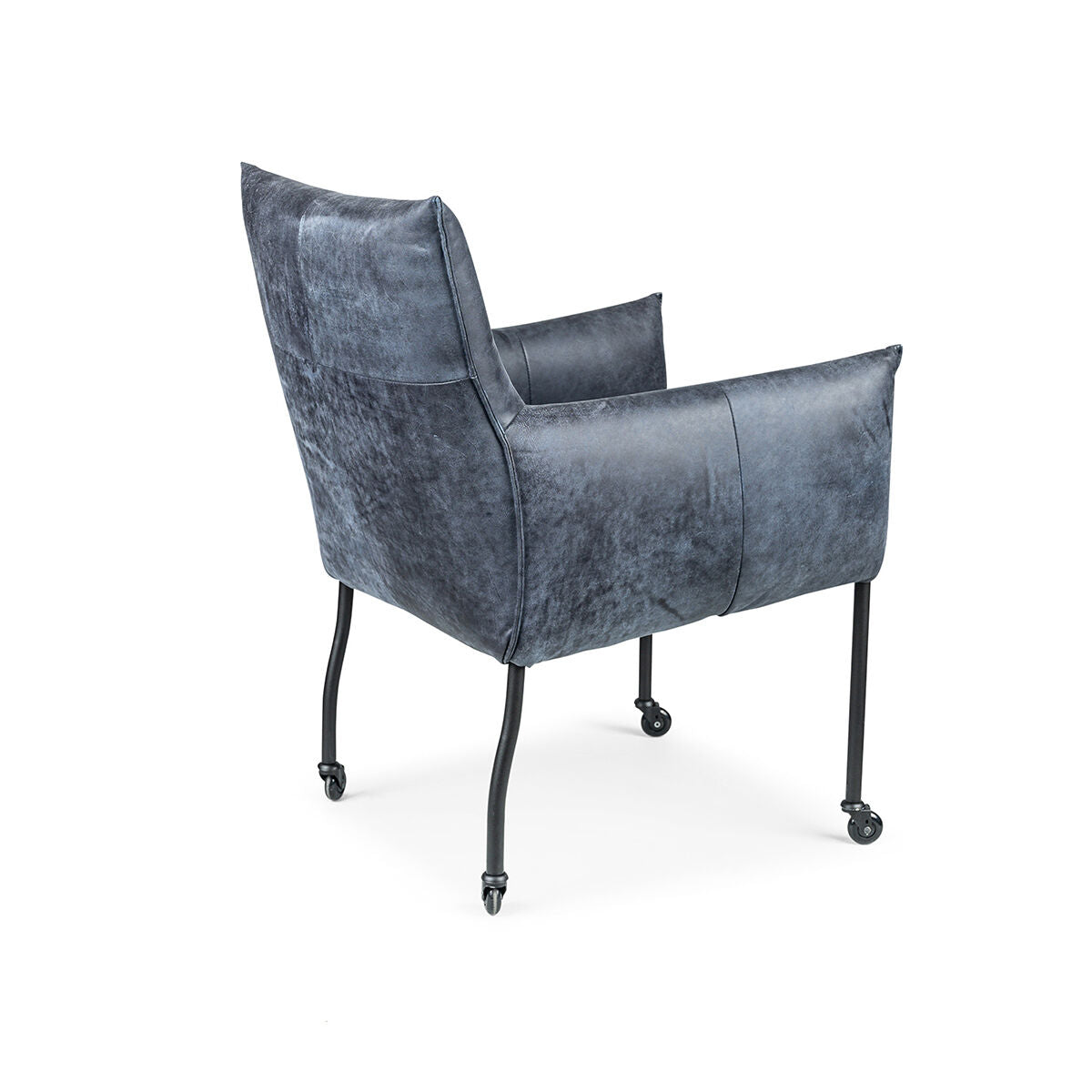 De standaard uitvoering van de Forest met arm stoel is met een kapnaad en zwarte metalen poten op zwarte skatewieltjes.