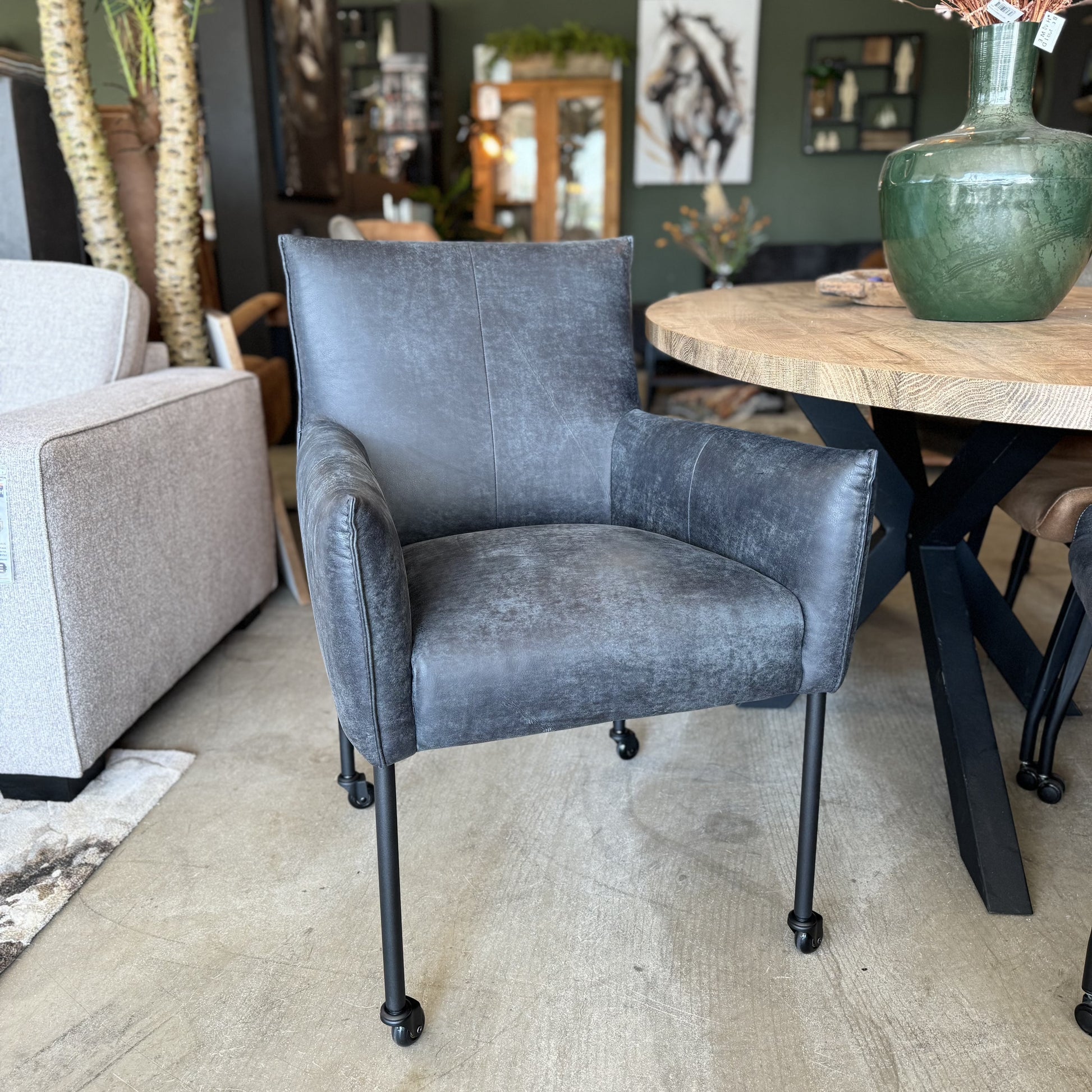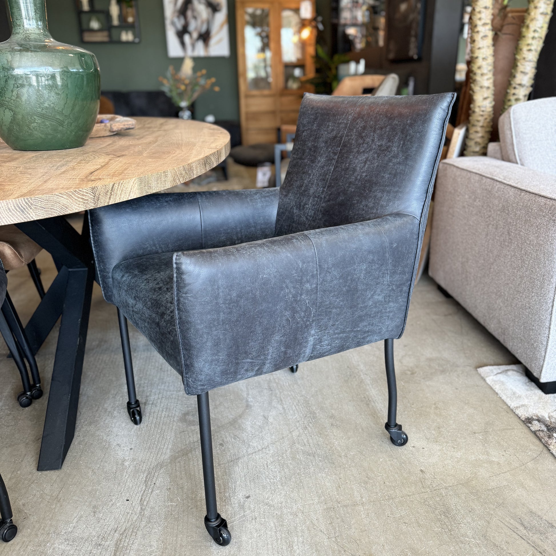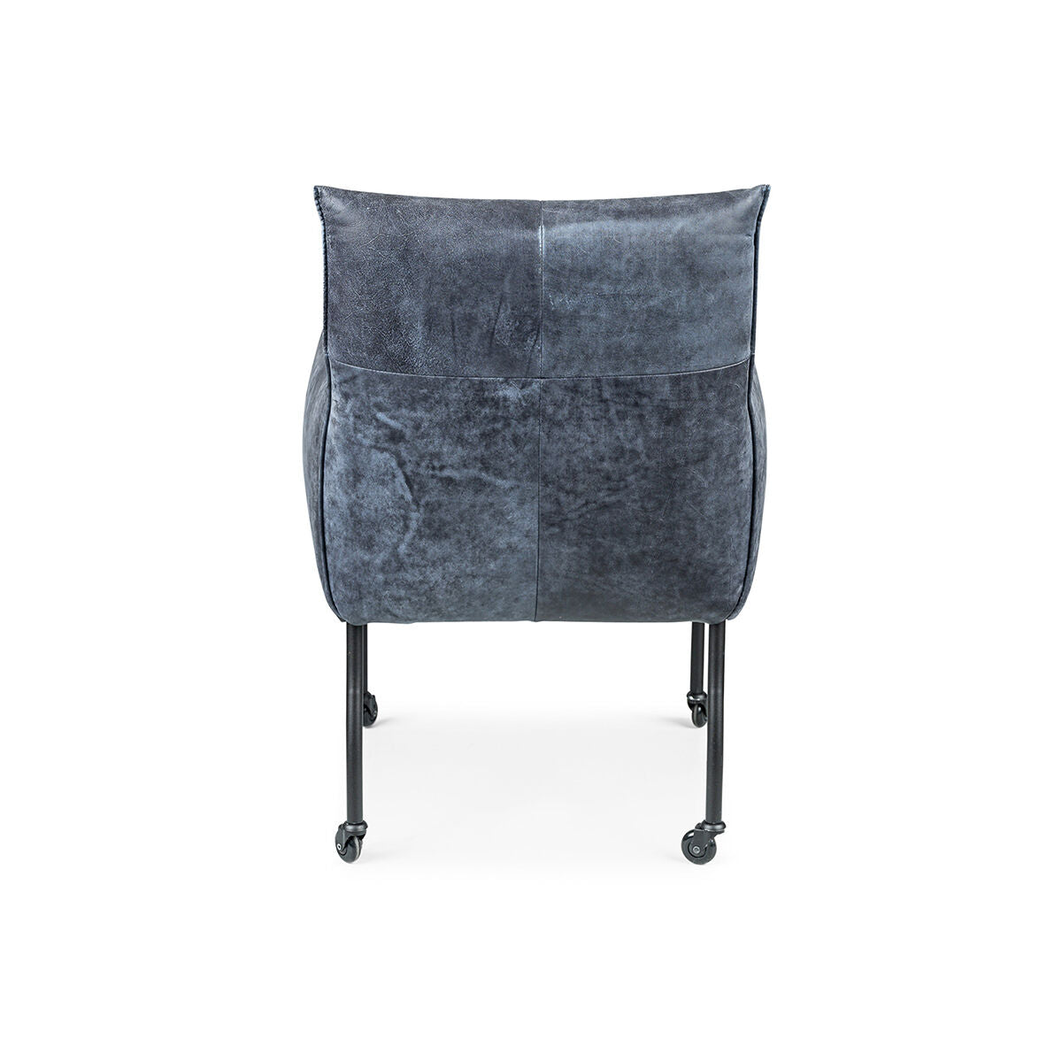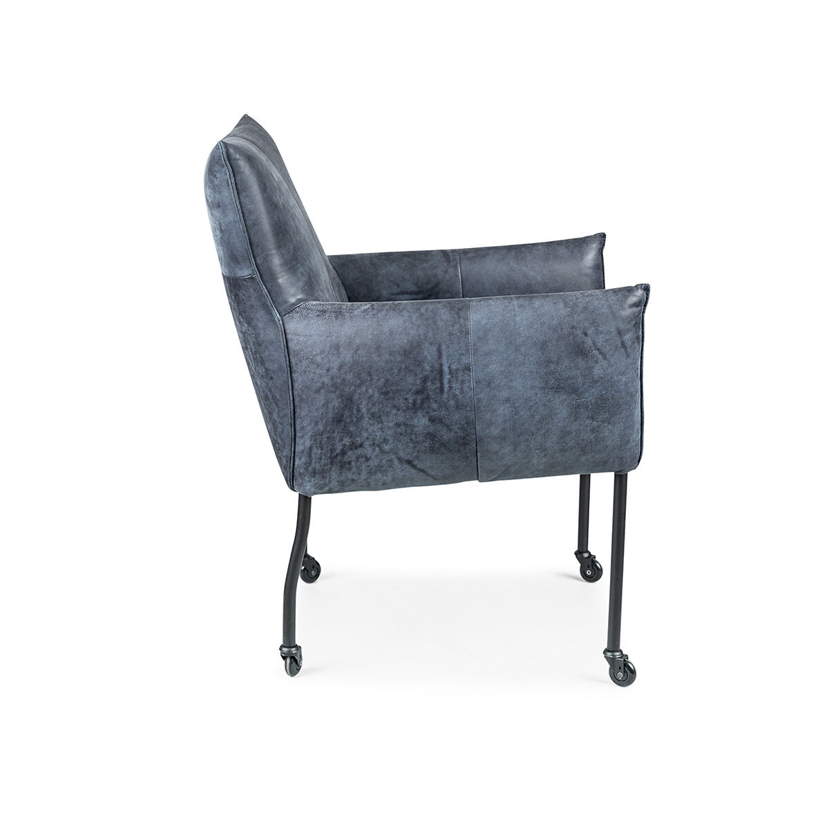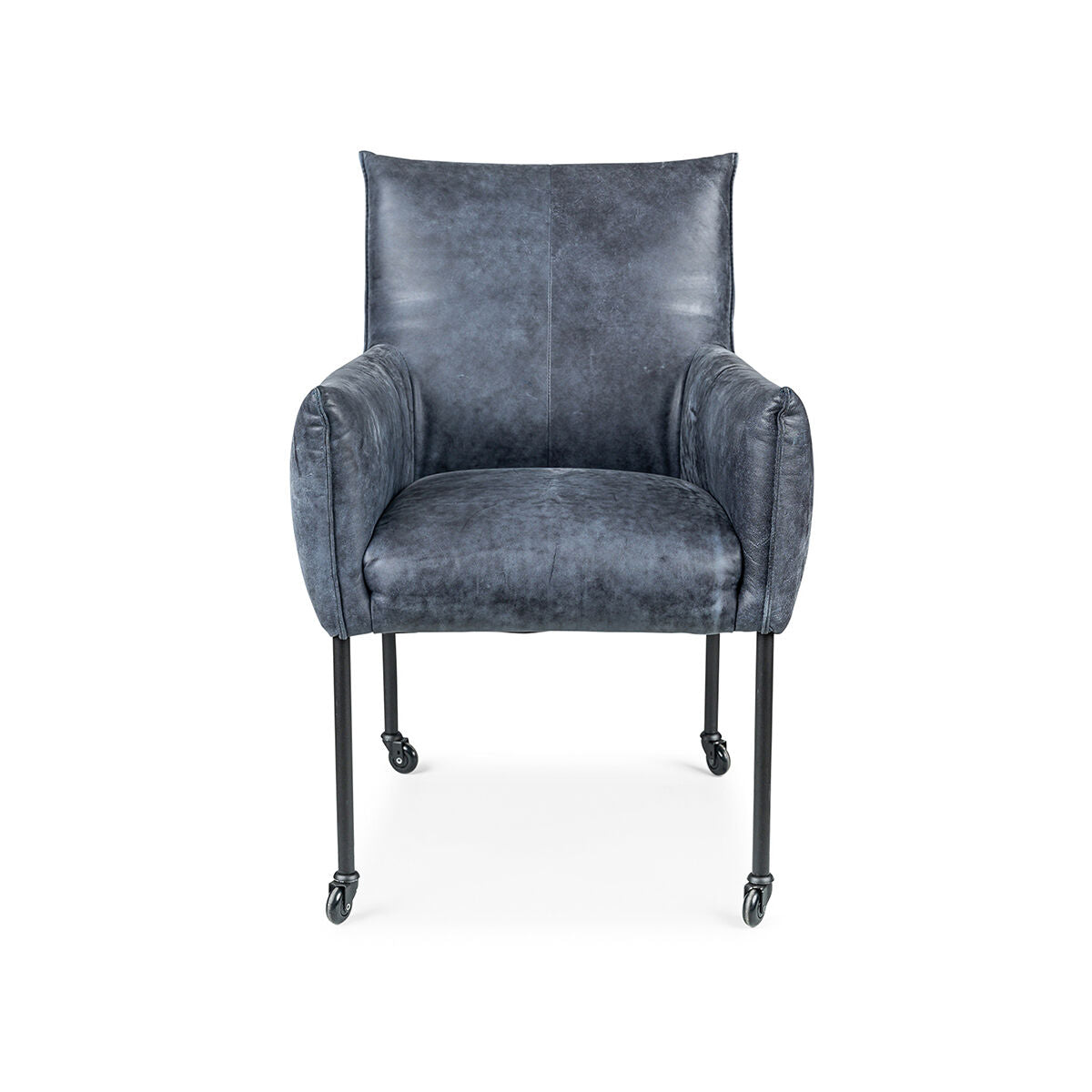 De standaard uitvoering van de Forest met arm stoel is met een kapnaad en zwarte metalen poten op zwarte skatewieltjes.