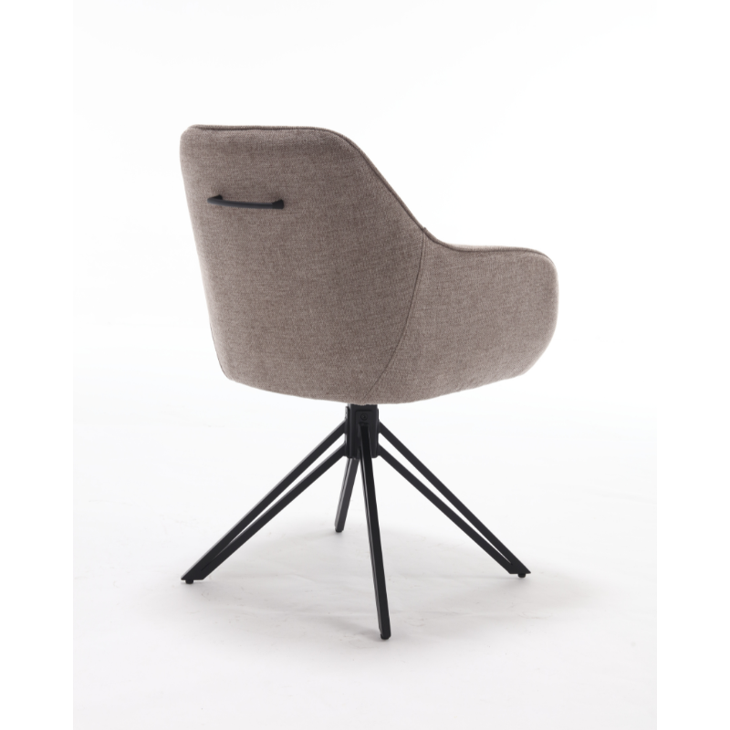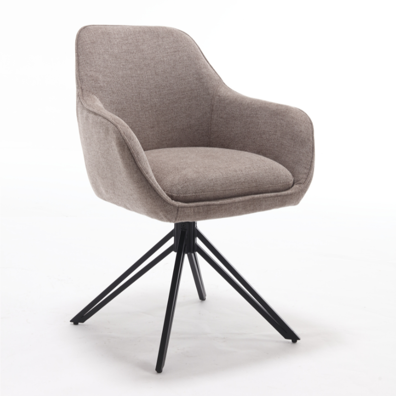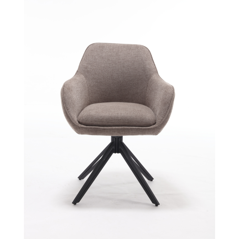 Eetkamerstoel Jens is bekleed met de Brego-stof. De stoel is 180 graden draaibaar en heeft een return memory functie. De stoel is voorzien van een metalen zwarte poot.