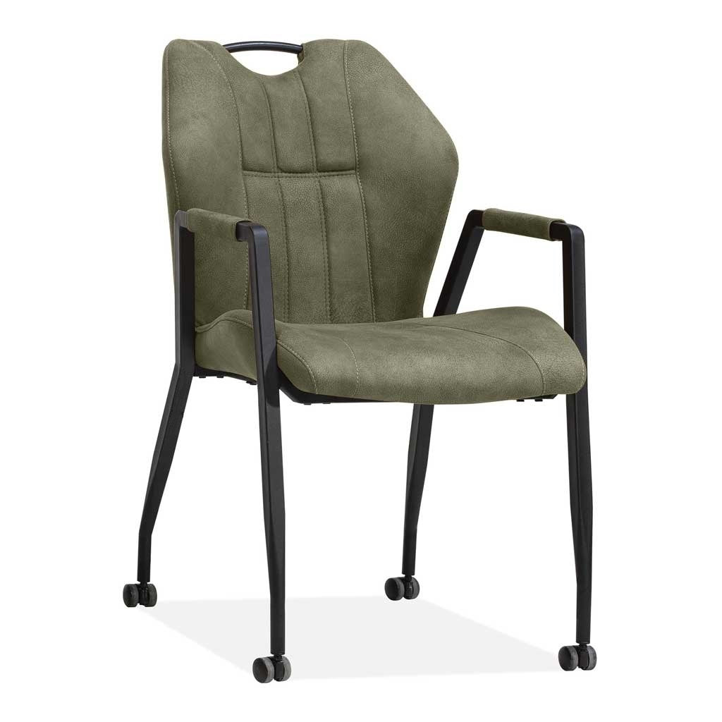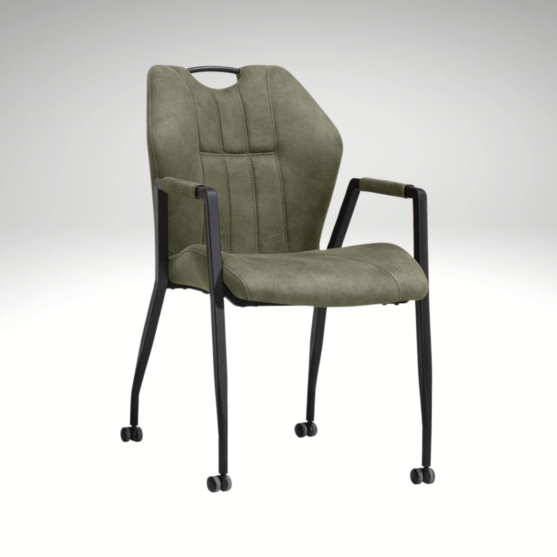 De Olivier is een eetkamerstoel van DFM Wonen die goed kan worden gecombineerd met een eigentijdse inrichting. In de rugleuning zitten verticale stiksels, dit geeft de stoel een stoer uiterlijk. Ook heeft de eetkamerstoel Olivier heeft armleuningen die open zijn wat een ruimtelijke uitstraling geeft in het interieur. Door de wieltjes is deze eetkamerstoel zeer wendbaar en flexibel in gebruik.