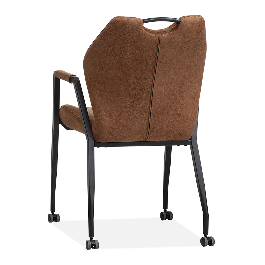 Met de handgreep in het midden van de rugleuning is deze eetkamerstoel makkelijk te verplaatsen. De bekleding is van stof, waarbij u kunt kiezen uit de kleuren cognac, antraciet of mosgroen.
