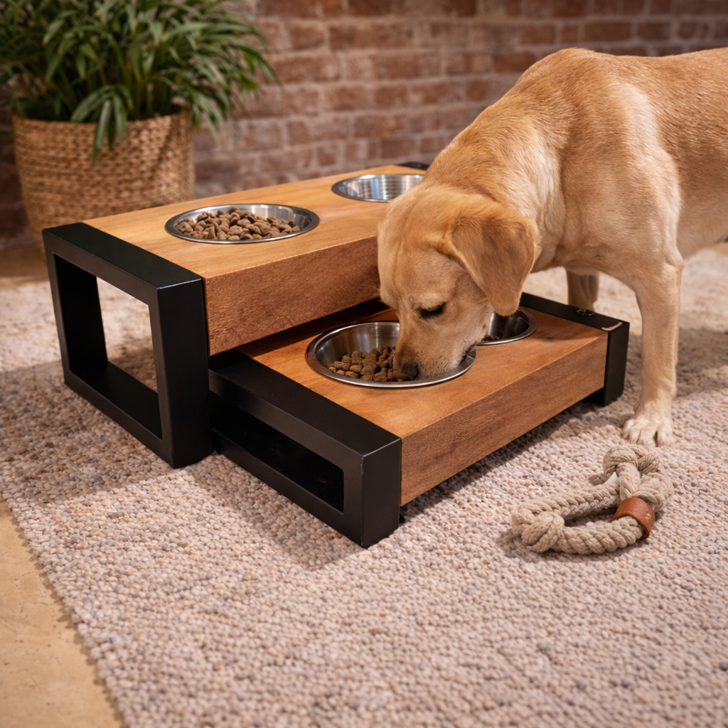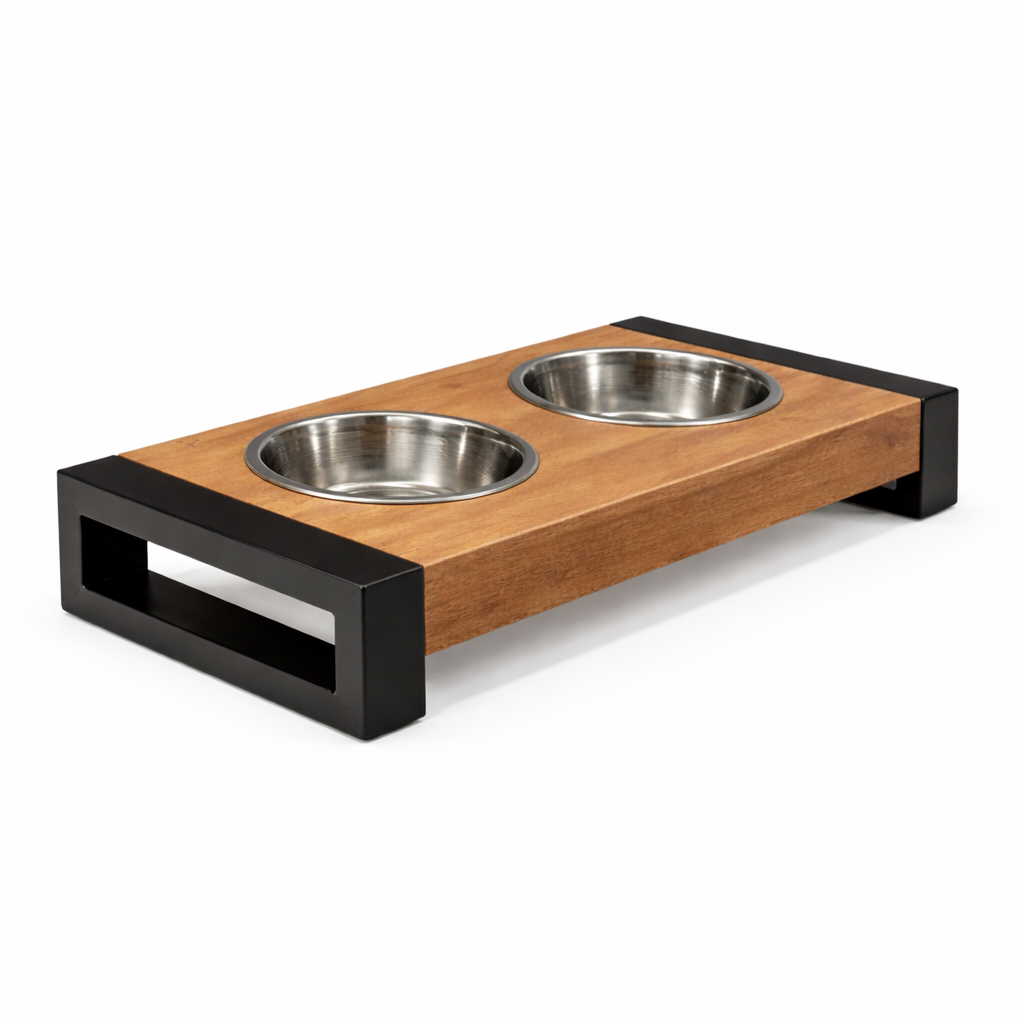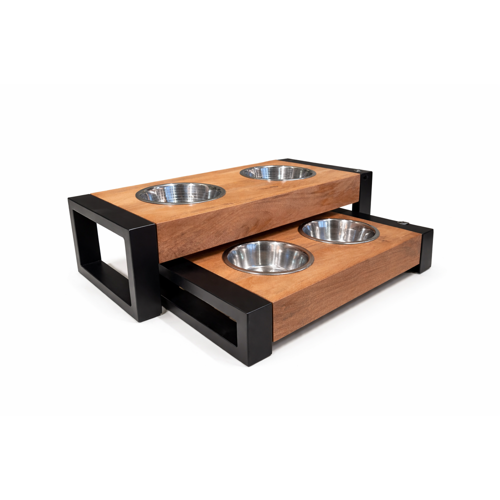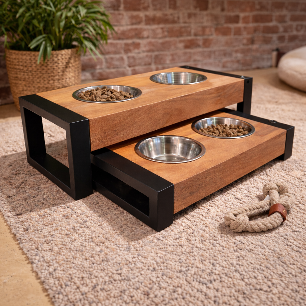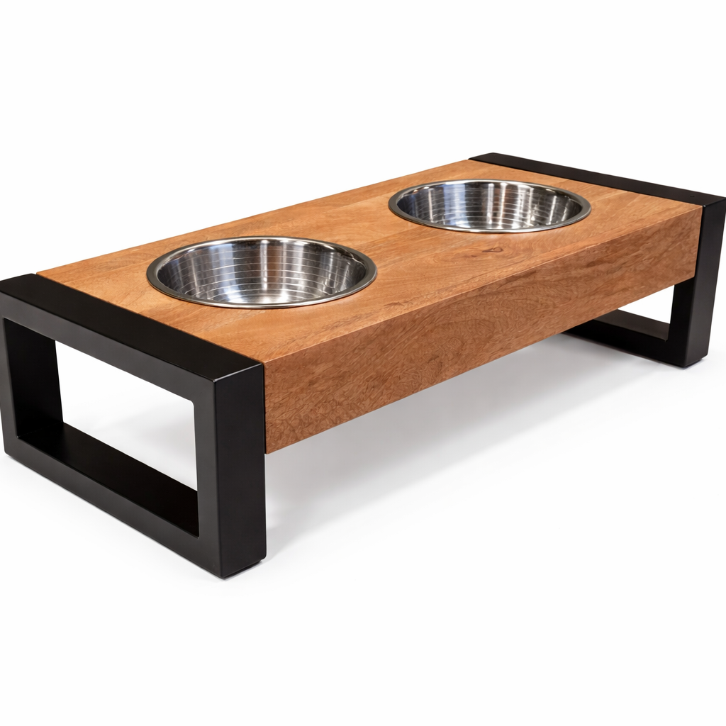 Deze prachtige hondenbak Mangohout is voorzien van 2 bakken. Hij is verkrijgbaar in twee afmetingen. Hij is gemaakt van mangohout in combinatie met een zwart metalen frame. Hierdoor past de bak perfect in ieders interieur. Door de strakke vormgeving is het een ware eyecatcher in de keuken, hal of woonkamer. Al onze mangohouten meubelen worden met de hand gemaakt, inclusief het ijzerwerk. Hierdoor is het mogelijk dat er karakteristieke oneffenheden en deukjes in het hout en ijzerwerk kunnen zitten, zoals je kunt zien bij onze showmodellen.