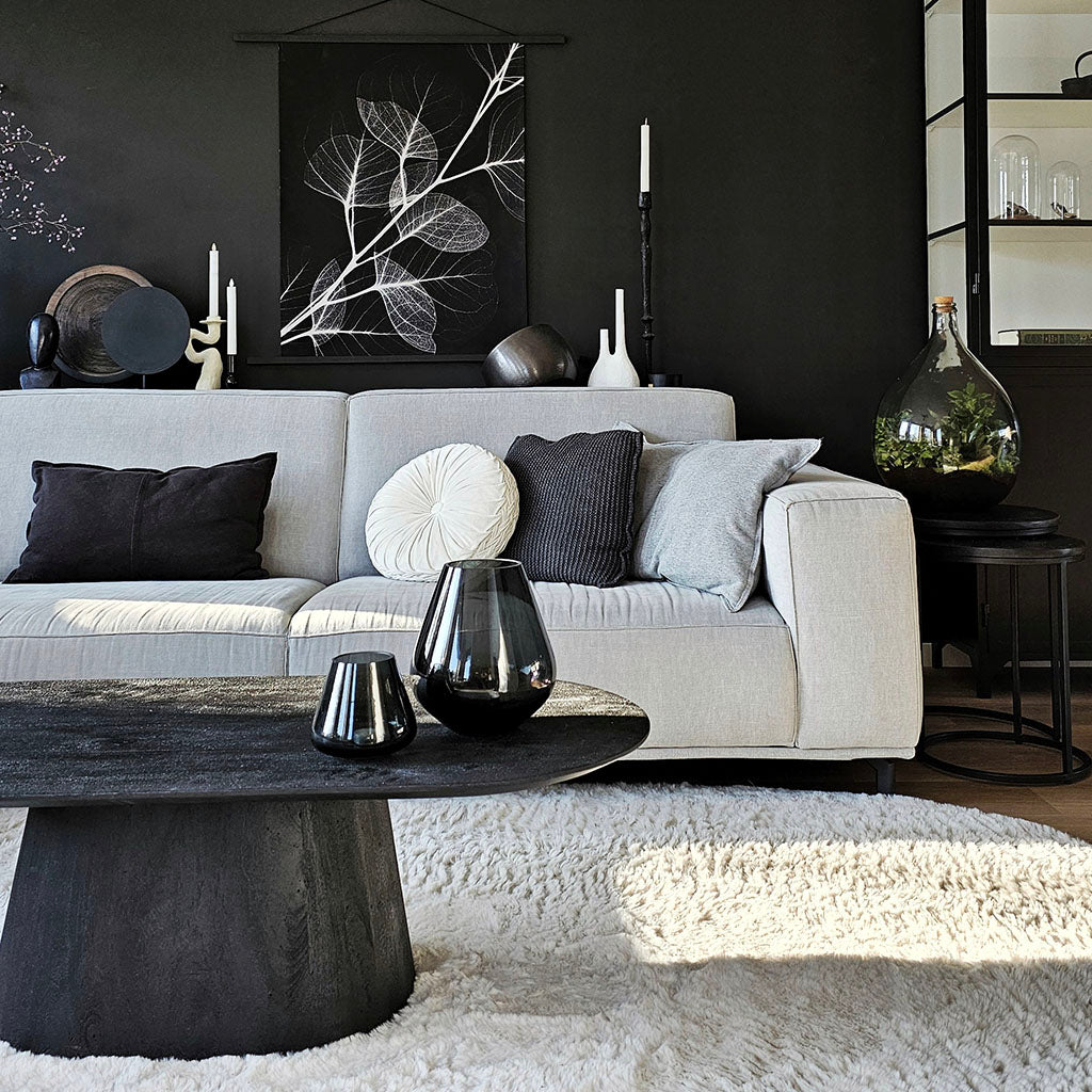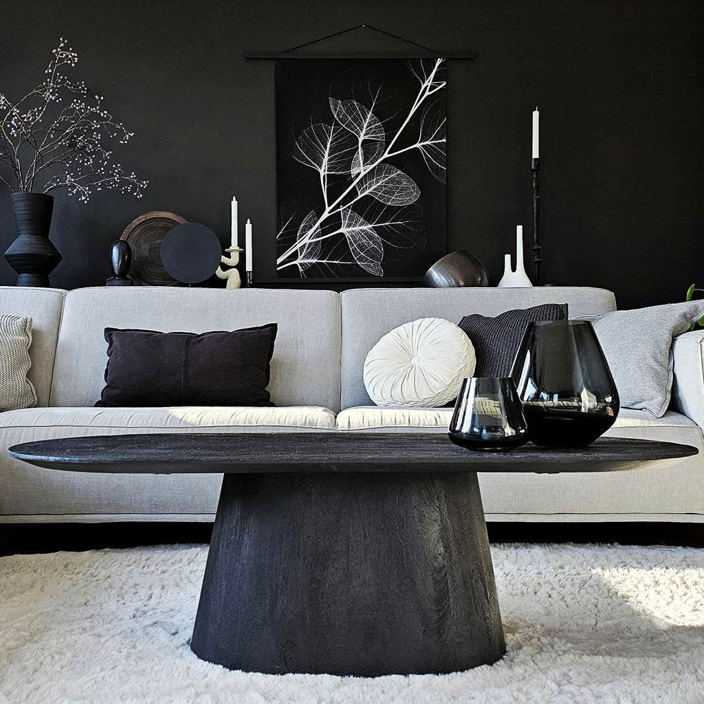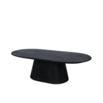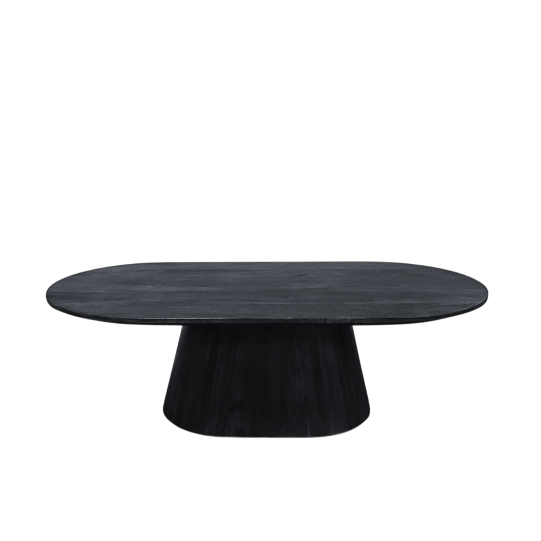 Deze ovale salontafel van zwart mangohout is een stijlvolle en functionele toevoeging aan elke woonkamer. Het glad afgewerkte blad en het stevige onderstel geven de tafel een luxe uitstraling, terwijl de organische vorm zorgt voor een warme en toegankelijke sfeer.