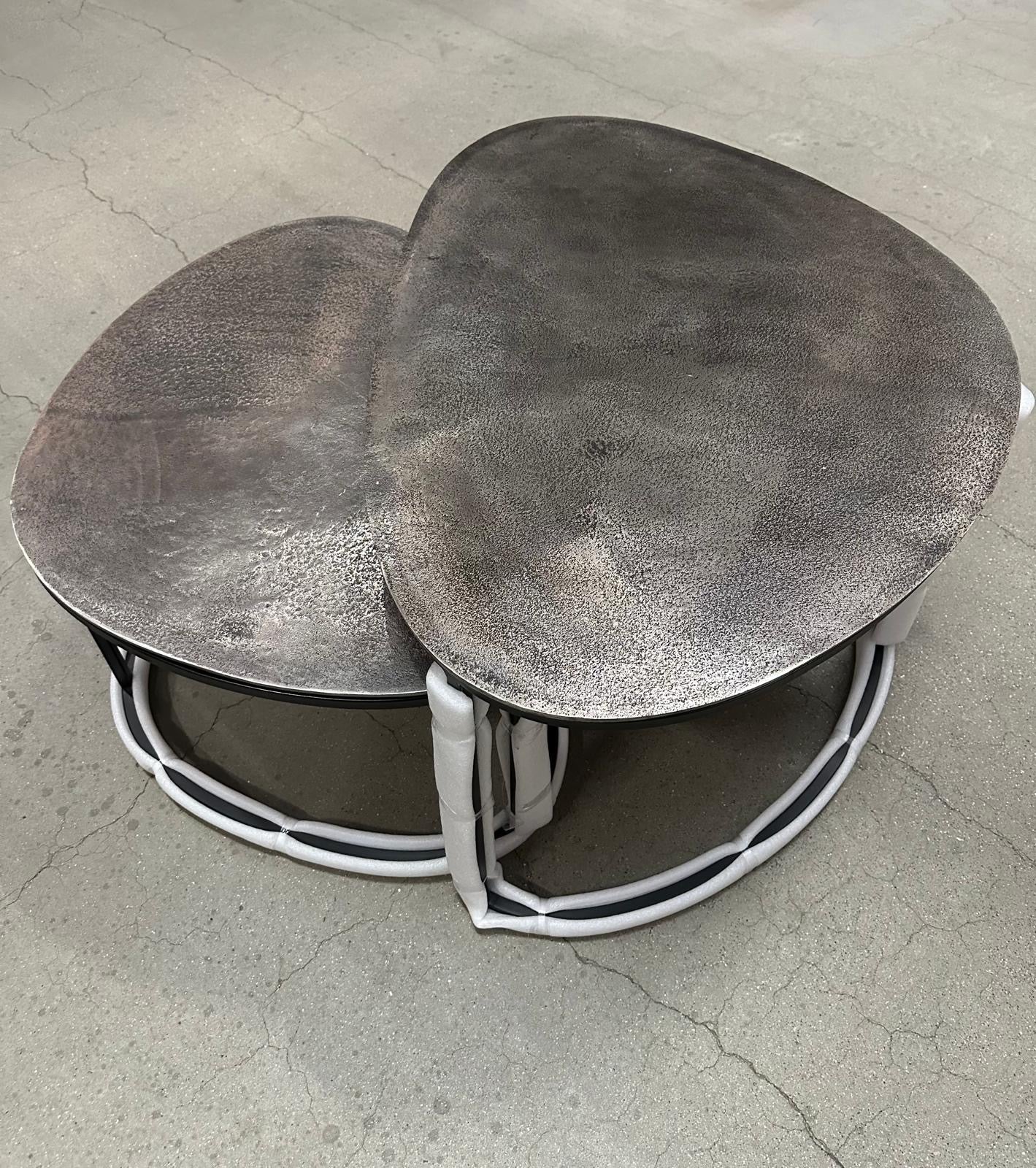 Salontafel set Lana is een set van twee salontafels. De bladen zijn gemaakt van aluminium. De frames van de tafeltjes zijn gemaakt van ijzer en afgewerkt met een zwarte finish.