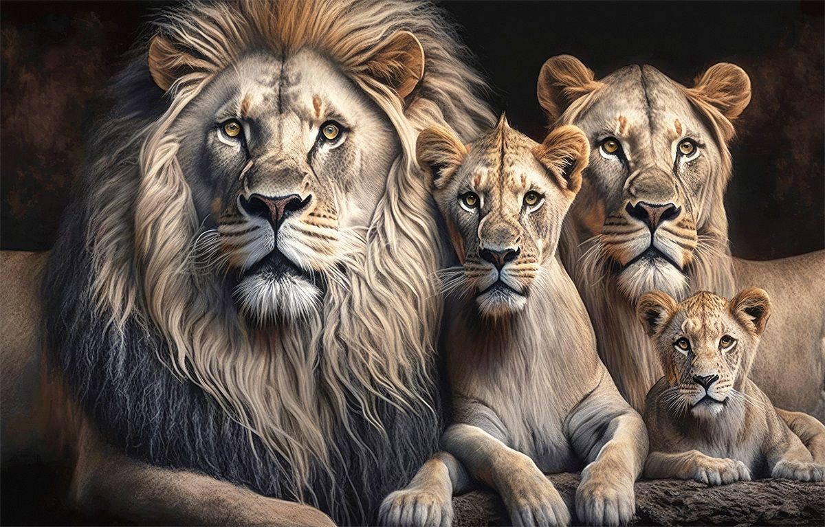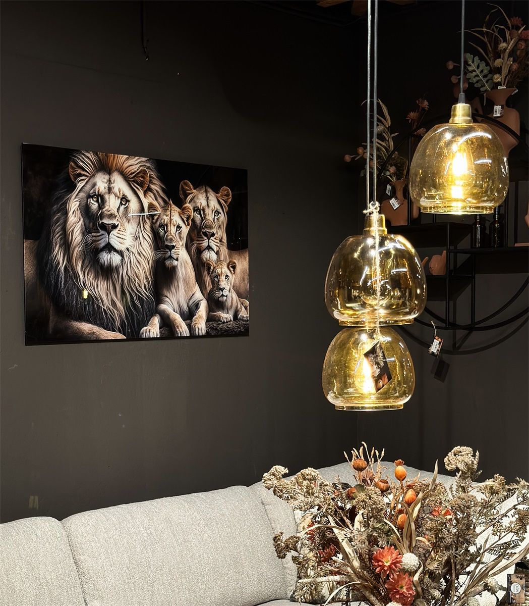 Wat een indrukwekkend leeuwengezin met twee welpen die je trots en recht aankijken. De leeuwen in onze collectie van glasschilderijen stralen warmte en majestueusheid uit. Het schilderij heeft de afmetingen 110x70x0,4 cm.